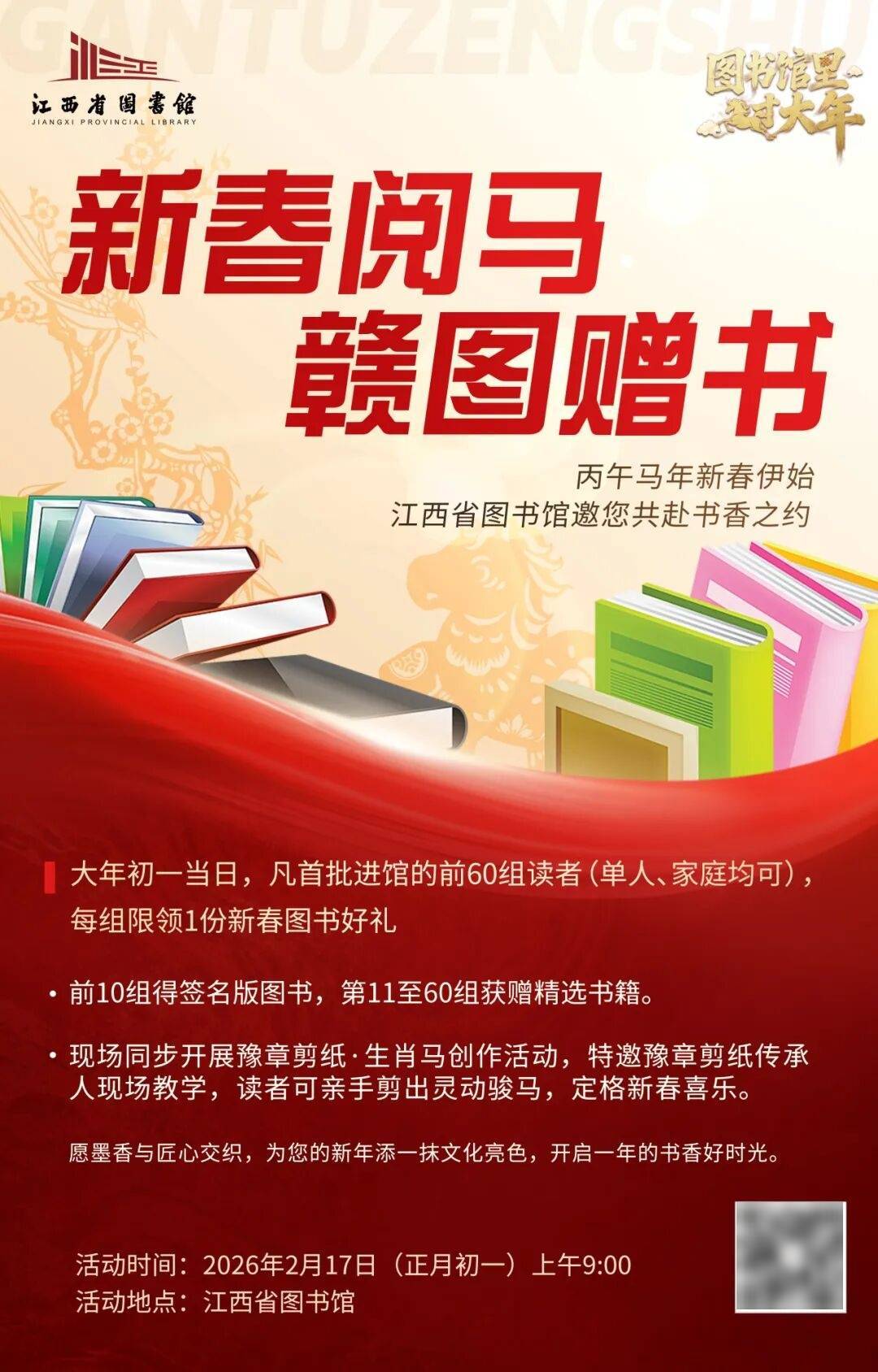 活动介绍:丙午马年新春伊始,江西省图书馆邀您共赴书香之约。大年初一当日,凡首批进馆的前60组读者(单人、家庭均可),每组限领1份新春图书好礼。愿墨香与匠心交织,为您的新年添一抹文化亮色,开启一年的书香好时光。