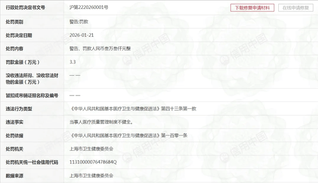 公开信息显示,泰康拜博口腔旗下机构近期已因多次违规行为受到监管处罚。2025年10月,江西泰康拜博口腔医院有限公司因违法违规收集使用个人信息,被相关部门处以警告并罚款3万元,该行为违反《中华人民共和国消费者权益保护法》相关规定;2026年1月,上海泰康拜博口腔总院因医疗质量管理制度不健全,被上海市卫生健康委员会给予警告、并罚款3.3万元。多次处罚也让泰康拜博口腔和管理体系的合规性受到外界质疑。